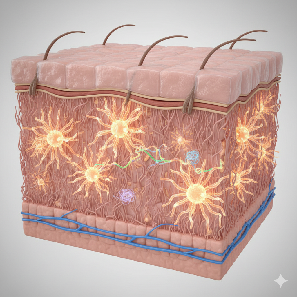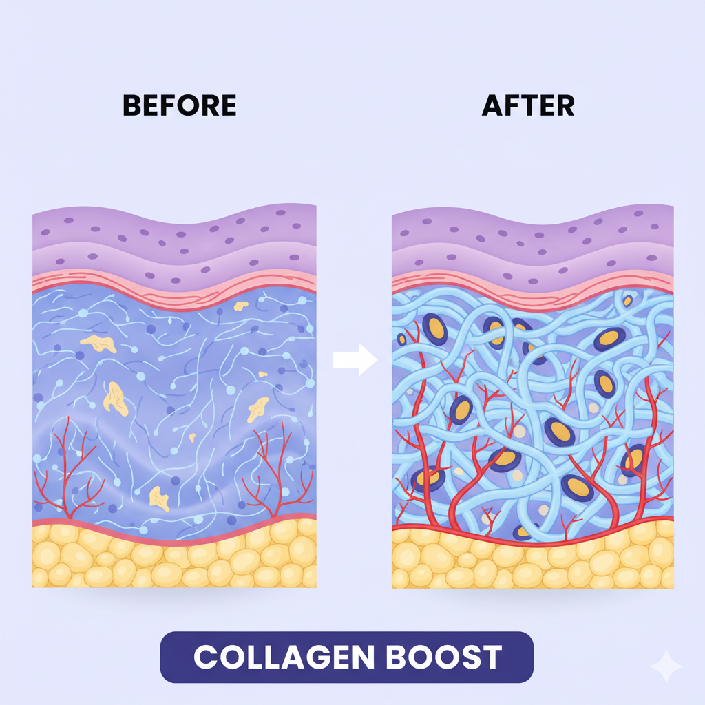 "Your skin's firmness, smoothness, and youthful glow come from collagen—a vital protein produced by specialized cells called fibroblasts in your dermis. As we age, collagen levels naturally decline, leading to fine lines, wrinkles, sagging, and dullness. But the real secret isn't just collagen itself; it's activating your fibroblasts."