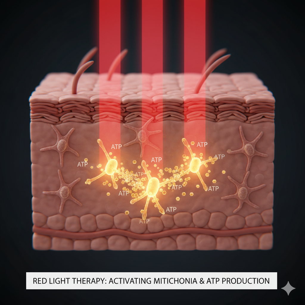 Red and Near-Infrared lights penetrate into the dermis and activate fibroblast cells — the cells that produce collagen and elastin. That stimulation triggers your skin’s natural repair and renewal cycle, helping firm skin, reduce fine lines, and restore elasticity from within, rather than only treating the skin’s surface.