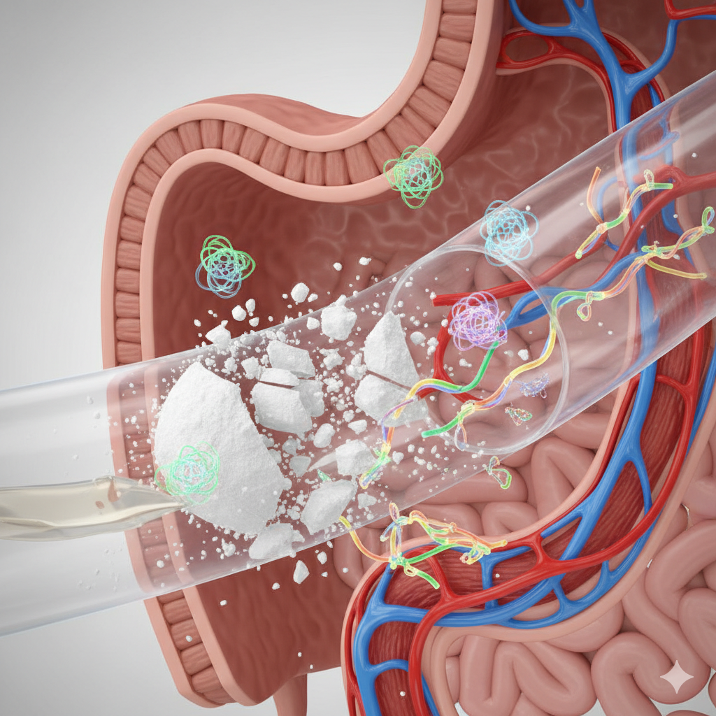 "Did you know that up to 90% of collagen powders you consume get destroyed during digestion? They break down in your gut (as shown above), meaning very little actually reaches your skin's fibroblasts – the cells responsible for creating new, firming collagen. This is why visible results from powders are often slow or minimal."